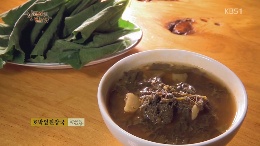 ‘호박잎된장국’은 호박잎을 빨래 빨듯이 박박 문질러서 물에 여러 번 씻어 손으로 잘라줍니다. 끓는 물에 감자 넣고 된장 풀고 고춧가루 등으로 양념을 한 뒤에 호박잎 넣고 푹 끓입니다.