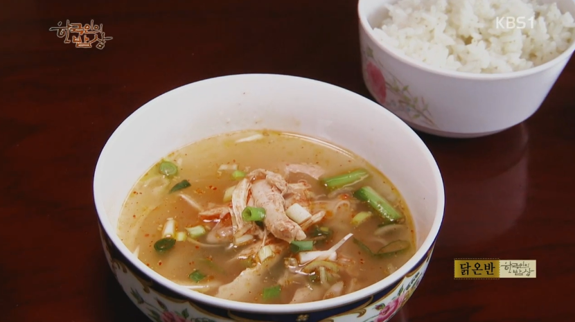 ‘닭온반(원반)’은 솥에 닭, 인삼, 대추, 마늘 등을 넣고 푹 삶아줍니다. 삶은 닭은 뼈를 고르고 살을 최대한 가늘게 찢어, 고춧가루, 다진마늘, 다진파 등을 넣고 주물주물해줍니다. 그릇에 밥 넣고 닭삶은 물 붓고 닭살과 파를 올려먹습니다.