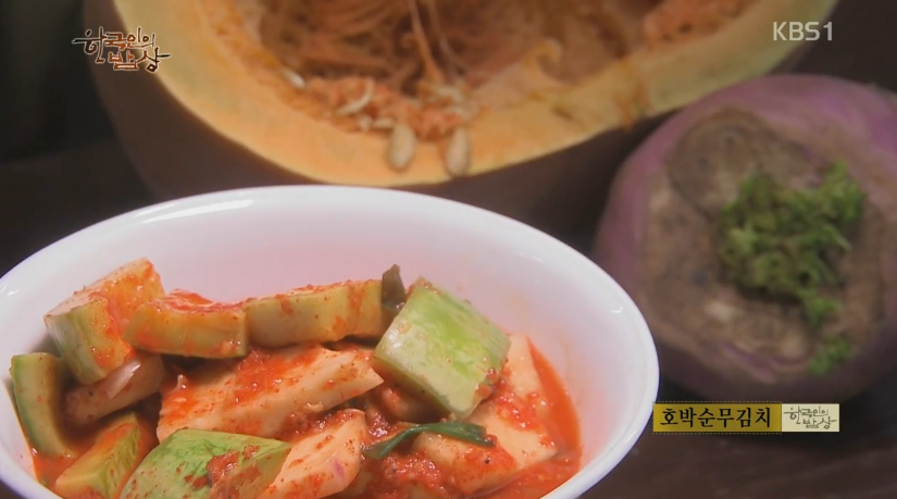 ‘호박순무김치’는 늙은 호박을 반을 잘라 씨를 발라내고 껍질째 얇게 썰어 줍니다. 순무도 나박하세 썰어 섞어 쪽파, 양파 등 야채를 넣고 고춧가루, 젓갈 등을 넣고 잘 섞어 시큼해질 때까지 잘 익혀 먹습니다. 보통 생으로 먹기보다 찌개로 먹기 때문입니다.