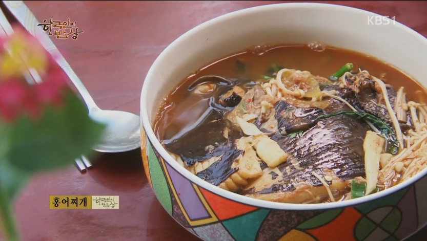 ‘홍어찌개’는 다시마 육수에 고추장, 고춧가루 넣고 홍어를 손질해서 토막으로 넣고 끓입니다. 끓으면 미나리, 팽이버섯 등 야채를 넣고 한소끔 끓여냅니다.