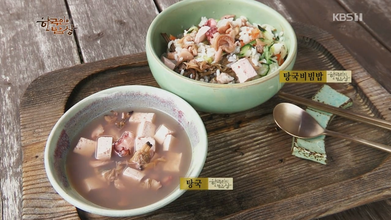 ‘탕국’은 조갯살을 썰고 바지락살, 문어 송송 두부를 해산물과 비슷하게 썰고 물을 붓고 국간장으로 간을 맞춰서 자박하게 끓여줍니다. 그리고 그릇에 밥을 넣고 나물들을 올리고 탕국을 넣어서 비벼먹습니다.