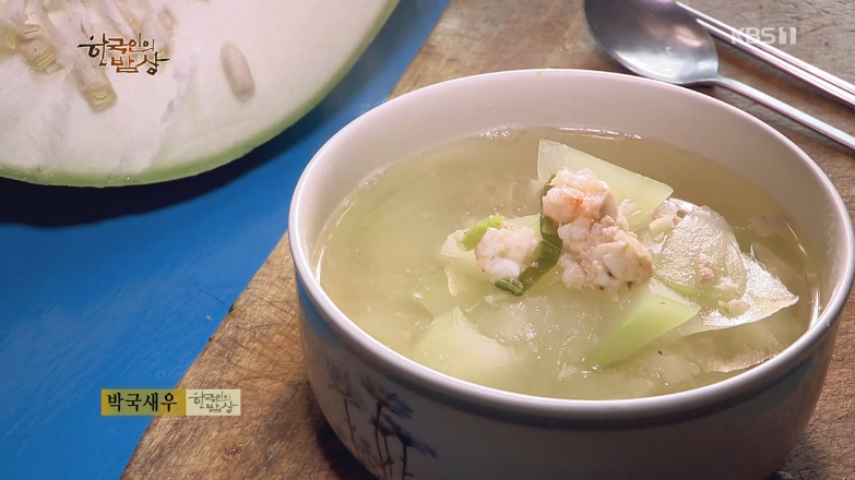 ‘박국새우’는 박의 껍질을 까고 안에 씨를 바른 뒤에 박을 나박하게 썰어줍니다. 보리새우의 살을 발라서 굵직하게 다져줍니다. 냄비에 박을 넣고 보리새우를 껍질을 까고 굵직하게 썰어 고추송송, 다진마늘을 넣고 잘 섞은 뒤에 소금으로 간을 해서 끓여 식혀 먹습니다.