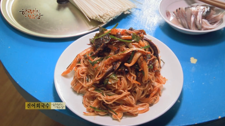 ‘전어회국수’는 전어를 포를 떠서 뼈를 바르고 가늘고 길게 회를 뜬 뒤에 그릇에 담고 깻잎, 부추, 상추, 양파를 넣고 고춧가루, 설탕, 깨소금, 고추장, 식초 등을 넣고 버무려줍니다. 그리고 삶을 소면을 비벼서 먹습니다.