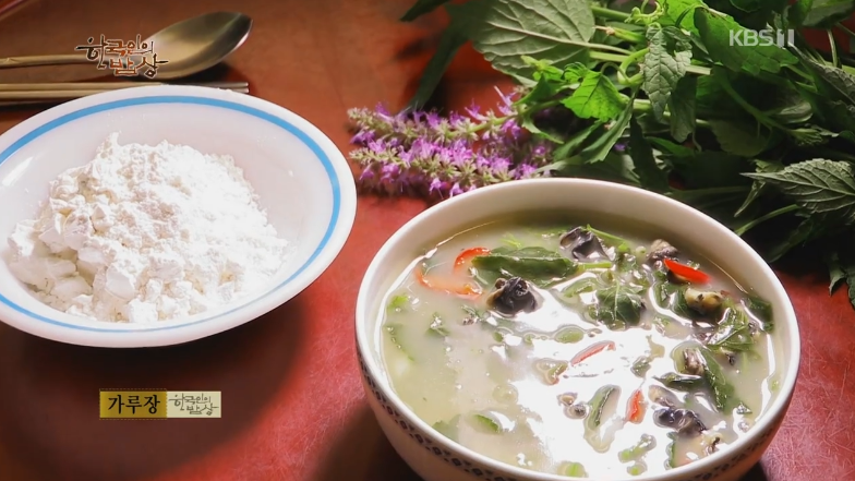 ‘가루장’은 된장물에 삶은 논고동(우렁이)살을 넣고 끓이다가 밀가루 푼 물을 아주 조금씩 넣으면서 계속 저으면서 끓입니다. 국물이 걸쭉해지면 고추송송, 파송송 등 입맛에 맞게 야채를 넣는데 방아잎은 꼭 넣어 뭉근하게 끓입니다.