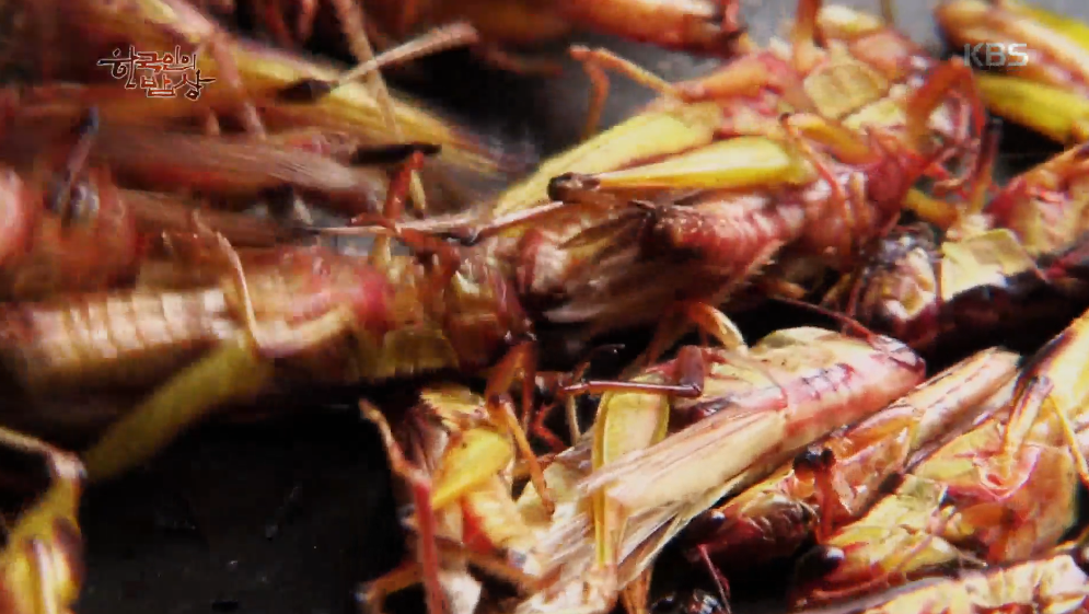 벼가 누렇게 익을 때즘 메뚜기가 벼 위로 올라오면 그 때 많이 잡습니다. 산 메뚜기를 달군 냄비에 넣고 뚜껑을 닫은 뒤에 노릇하게 볶아 먹습니다.