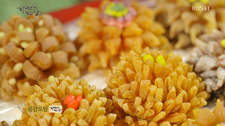 ‘곶감오림’은 지리산 곶감은 눌러서 자르고 손으로 만져서 꽃 모양을 만듭니다. 그리고 ‘꽃수과’는 밀가루 반죽에 색을 입혀서 색색이 쌓아 약한불에서 튀겨 만듭니다. 곶감 꽃에 꽃수과를 올려 완성합니다.
