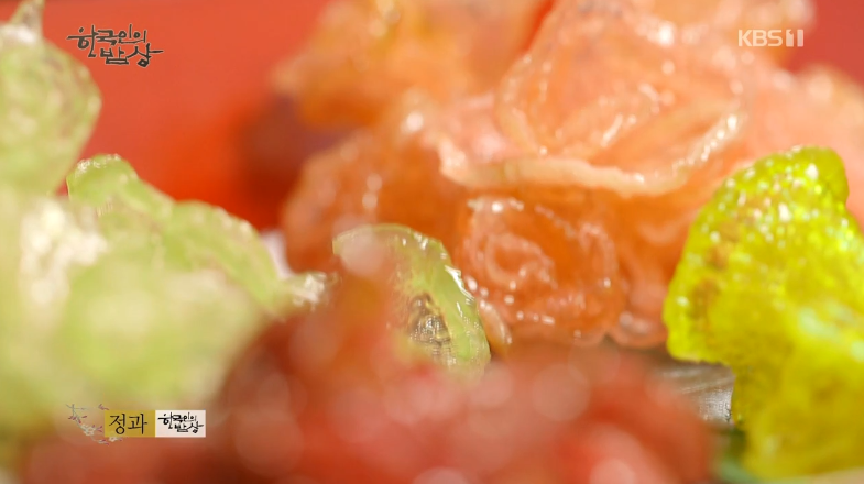 ‘정과’는 무에 색을 입혀서 말린 뒤에 설탕물에 절여 손으로 접어서 꽃모양을 만들었습니다.
