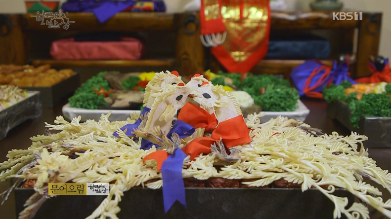 ‘문어오림’은 문어는 오림용 문어가 따로 있습니다. 문어 다리 껍질을 벗겨서 더 길게 말립니다. 말린 문어를 오려서 문어오림을 만듭니다. 자손 번성하라는 의미에서 닭을 만들어 청, 홍 리본을 만들어 올려줍니다.