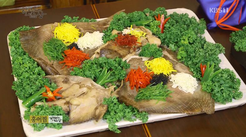 ‘홍어찜’은 홍어에 생강, 소금, 술을 뿌린 뒤에 30분 정도 재워 두었다가 찜통에 넣고 찌고 오방색으로 고명(나쁜기운을 몰아내고 좋은 기운을 부르는 일종의 깃발입니다.)을 올려줍니다.