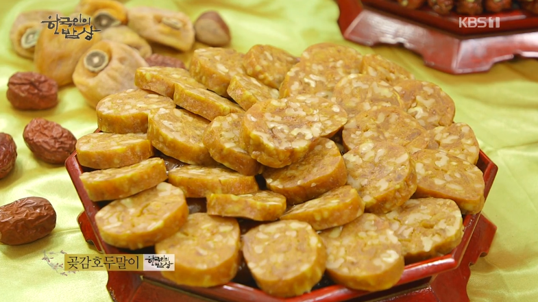 ‘곶감호두말이’는 곶감을 반을 갈라 펴서 씨를 바르고 호두를 듬뿍 넣고 감싸 계속 반죽을 해서 길게 모양을 잡아 2~3일 꾸덕하게 말려서 썰어줍니다.