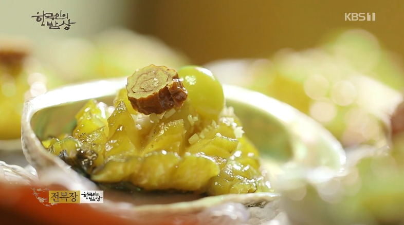 ‘전복장’은 전복을 손질해서 칼집을 잘게 내주고 끓는 물에서 익혀준 뒤에 찬물에 씻어 줍니다. 대파, 생강, 마늘을 채썰어 기름에 볶은 뒤 건더기는 걸러내고 그 기름에 굴소스, 미림을 넣고 전복을 조려줍니다. 그리고 전복껍질에 조린 전복을 올리고 다진 잣을 뿌리고 대추고명과 은행을 올려줍니다.