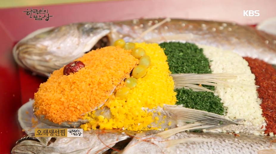 ‘오색생선찜’은 시루에 무를 얇게 썰어 올리고 도미를 손질해서 칼집을 내서 올린 뒤에 쪄줍니다. 당근, 계란, 실고추 등 오방색으로 도미 위에 꾸며줍니다. 조기는 좋아지라고 민어는 밀어달라고 도미는 도와달라고 생선이름에 따라 의미를 부여했습니다.