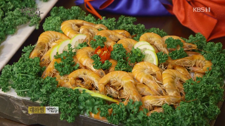 ‘대하알찜’은 대하를 손질한 후 반을 갈라 칼집을 냅니다. 요리술, 소금, 후추, 참기름을 섞어 새우에 발라 재워둡니다. 마요네즈, 날치알, 갖은채소, 설탕, 후추 등을 섞어서 새우배에 가득 채워서 오븐에서 구워줍니다.