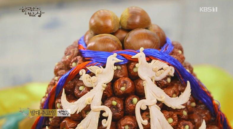 ‘밤대추고임’은 대추에 잣을 박아 이쑤시개로 꽂으면서 쌓아주고 그 안 쪽에 밤으로 속에 채우면서 위로 쌓아줍니다. 그리고 청,홍실과 오징어로 만든 꾸밈을 해줍니다.