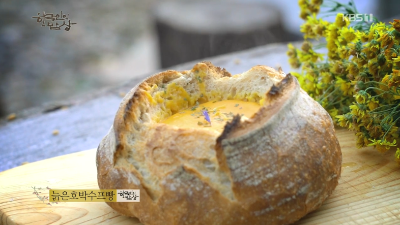 ‘늙은호박수프빵’은 양파를 볶고 삶은 늙은 호박을 넣고 물을 넣고 끓이다가 우유를 넣고 갈아서 끓입니다. 천연발효빵을 파서 그릇을 만들어서 스프를 넣어서 먹습니다.