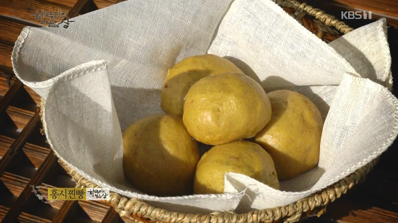 ‘홍시찐빵’은 홍시를 으깨서 채에 내려서 우리밀가루와 생막걸리를 넣고 잘 반죽을 해서 숙성을 합니다. 삶은 팥에 다진 호두를 섞어서 숙성시킨 빵반죽에 넣고 빚어줍니다. 시루에 올려 쪄냅니다.