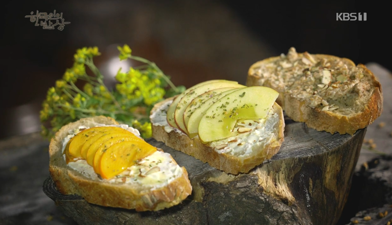 ‘술지게미 오픈샌드위치’는 빵 위에 술지게미잼을 올리고 꿀을 뿌린 뒤에 제철 과일이나 견과류를 올려 만들어 먹습니다.
