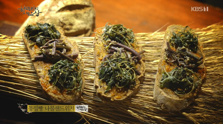 ‘통밀빵 나물샌드위치’는 빵에 쌈장소스를 바르고 취나물, 쑥부쟁이, 고사리를 올려서 먹습니다.