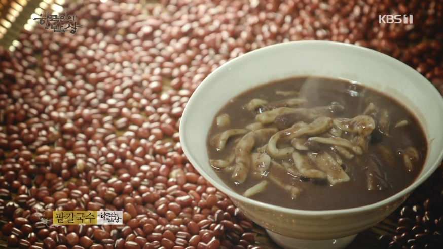 ‘팥칼국수’는 팥을 푹 삶아서 면보에 넣고 물을 부어 잘 치대면서 걸러냅니다. 밀가루 반죽을 해서 밀어 면을 만듭니다. 팥물을 솥에 넣고 계속 저으면서 끓이고 면을 넣어 끓여냅니다.