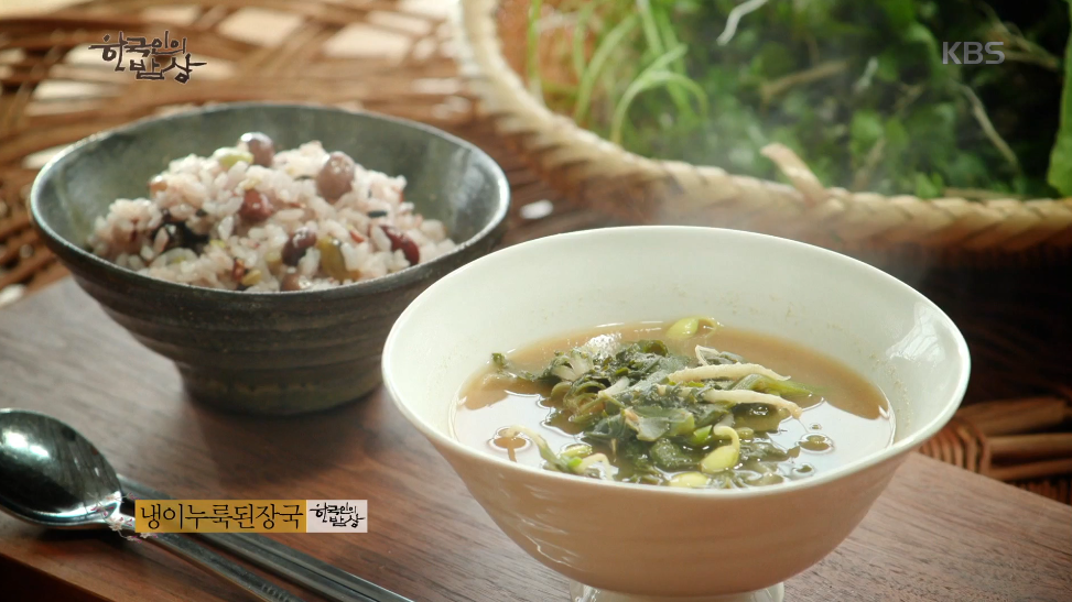 ‘냉이누룩된장국’은 누룩된장(된장을 치댈 때 누룩을 넣어 발효시킨)을 끓는 물에 채에 올려 풀어 주고 냉이, 콩나물 등을 넣고 끓입니다.