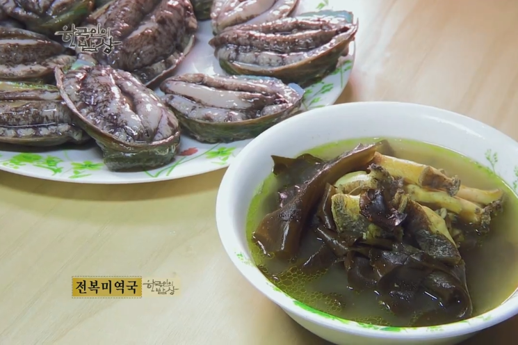 ‘전복미역국’은 냄비에 물을 붓고 전복껍떼기를 넣고 끓여 채반 육수를 부어 걸러냅니다. 냄비에 육수 미역넣고 끓이다가 전복살과 전복내장을 넣고 한소끔 끓입니다.