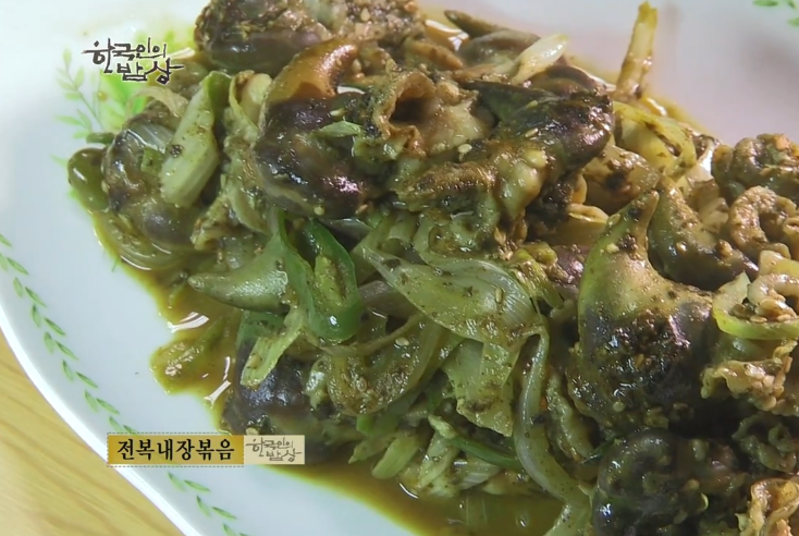 ‘전복내장볶음’은 팬에 기름을 두르고 파, 양파, 고추를 넣고 전복내장만 따로 발라서 넣은 뒤에 간장양념을 해주고 터지지 않게 살살 볶아줍니다.
