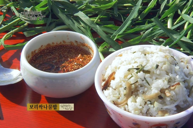 ‘보리싹나물비빔밥’은 솥에 쌀을 씻어 넣고 밥이 반 정도 익었을 때 삶은 고구마순, 표고버섯, 무채를 넣고 익히다가 뜸들이기 전에 보리싹 송송 썰어 넣고 위에 쌀뜨물을 그릇에 넣고 올려 뜸을 들입니다. 밥을 그릇에 담고 달래간장장을 넣고 비벼줍니다.