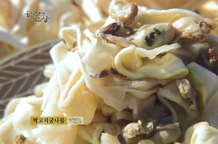 ‘박고지굴나물’은 잘 말린 박을 물에 살짝 불려 물기를 짜고 굴과 함께 굵은 소금 넣고 냄비에 넣고 박불린 물을 조금 넣고 조물조물해서 자작하게 끓입니다.