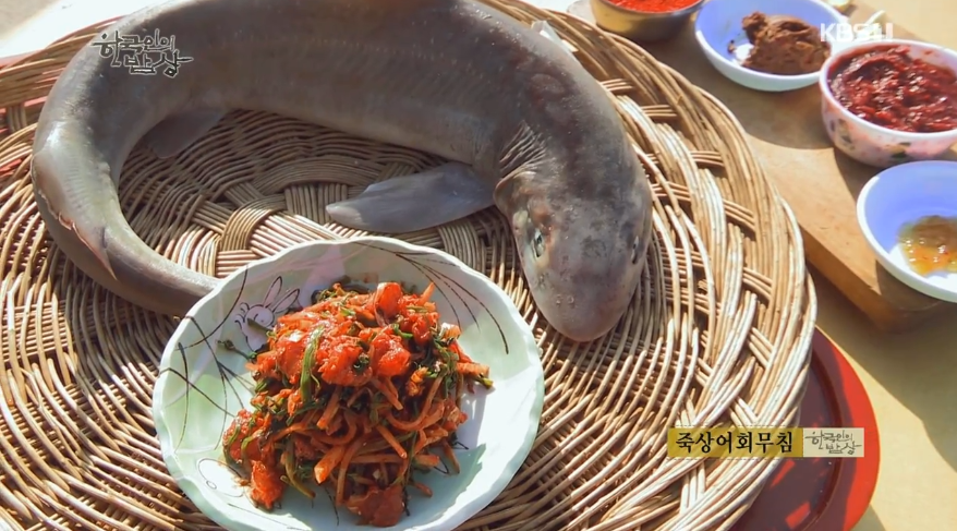 ‘죽상어회무침’은 죽상어(별상어)에 끓는 물을 부어서 짚으로 문질러서 껍질을 벗겨 씻어 내장은 먼저 골라서 애를 썰어 소금 살짝 찍어 먼저 먹고 살은 회를 뜹니다. 고추장, 된장, 고춧가루, 다진마늘, 식초, 고추 송송 썰어 잘 섞은 뒤에 상어회, 삶은 미나리, 무채를 넣고 무쳐줍니다.