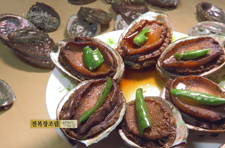 ‘전복장조림’은 전복은 솔로 문질러서 이물질과 진액을 다 닦고 입을 땝니다. 냄비에 황기, 감초, 파뿌리, 황칠, 양파 등을 넣고 물을 붓고 푹 끓입니다. 육수를 채에 걸러서 간장넣고 전복을 넣어서 조려줍니다.