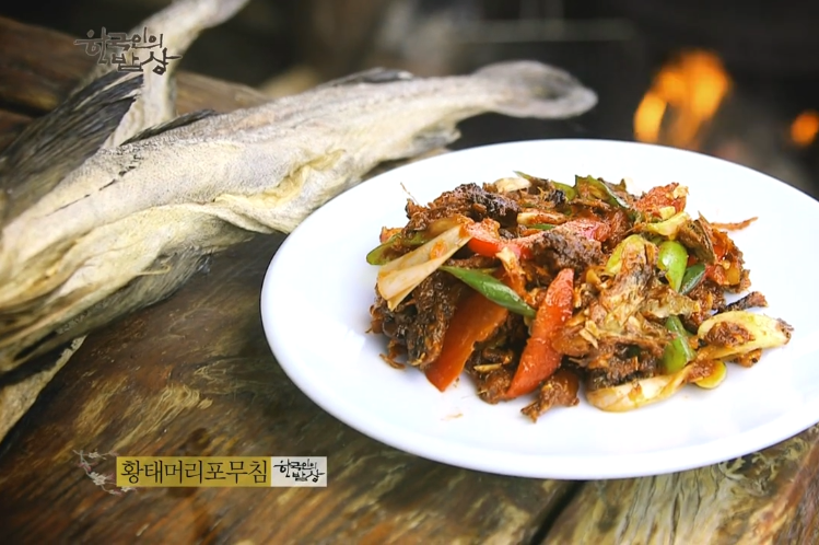 ‘황태머리포무침’은 황태대가리를 방망이로 패서 부드럽게 한 다음 반을 핀 뒤에 석쇠에 올려서 숯에 은근하게 구워줍니다. 그리고 뼈를 골라내고 살을 잘게 찢어 대파, 고추를 송송썰어 넣고 고추장양념으로 조물조물 무쳐줍니다.