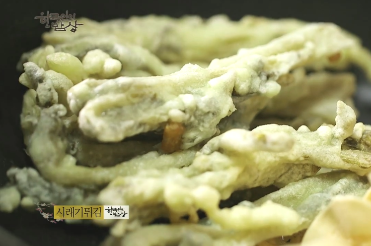 ‘시래기튀김’은 삶은 시래기를 밀가루에 한 번 무쳐 털고 반죽옷을 입혀서 기름에 튀겨냅니다.