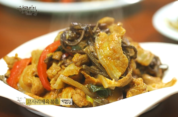 ‘고사리제육볶음’은 돼지고기에 고추장양념을 해서 주물주물해서 굽다가 고추장양념한 고사리와 대파, 고추 등 야채와 함께 같이 넣고 볶아줍니다.