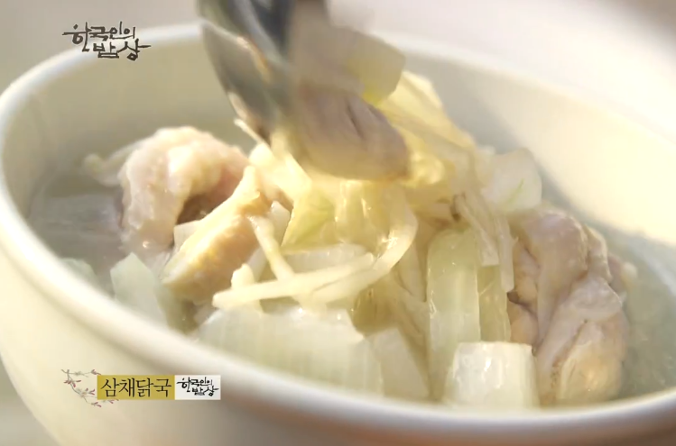‘삼채닭국’은 닭을 손질해서 솥에 물을 붓고 삼채와 무, 양파 등을 넣고 푹 끓여줍니다.