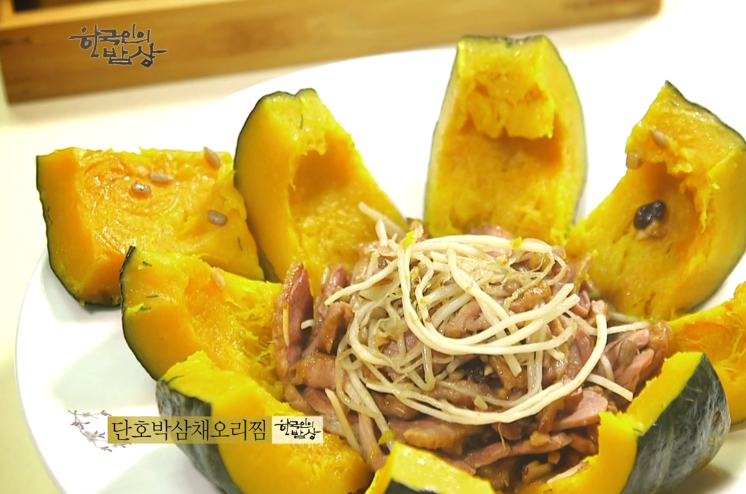 ‘단호박삼채오리찜’은 훈제오리와 삼채, 견과류를 넣고 볶다가 단호박 속을 파고 넣은 뒤에 위에 생삼채를 넣고 뚜껑을 닫아 압력밥솥에 넣고 쪄줍니다.