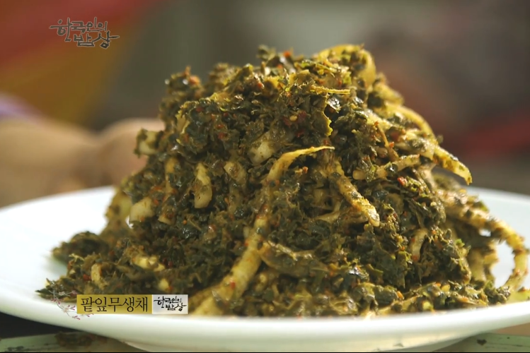 ‘팥잎무생채’는 말린 팥잎을 삶아서 다져줍니다. 무채와 된장, 다진마늘, 고춧가루, 참기름 등을 넣고 빡빡 무쳐줍니다.