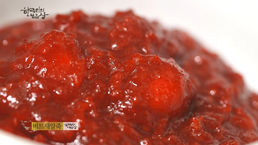 ‘비트새알죽’은 비트와 양파를 갈아서 끓이다가 불린쌀과 새알심을 넣고 끓입니다.