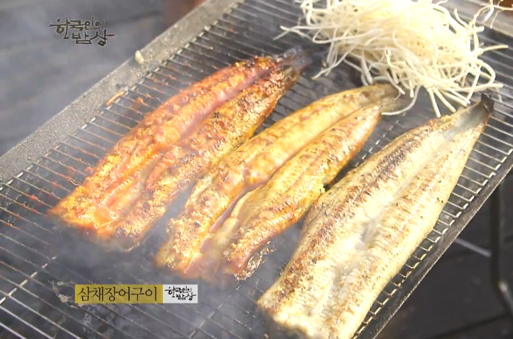 ‘삼채장어구이’는 숯불 위에 삼채를 깔고 그 위에 무태장어를 손질해서 껍질쪽으로 올려 구워줍니다. 다 구워 질 때쯤 고추장양념, 간장양념을 발라 구워냅니다.