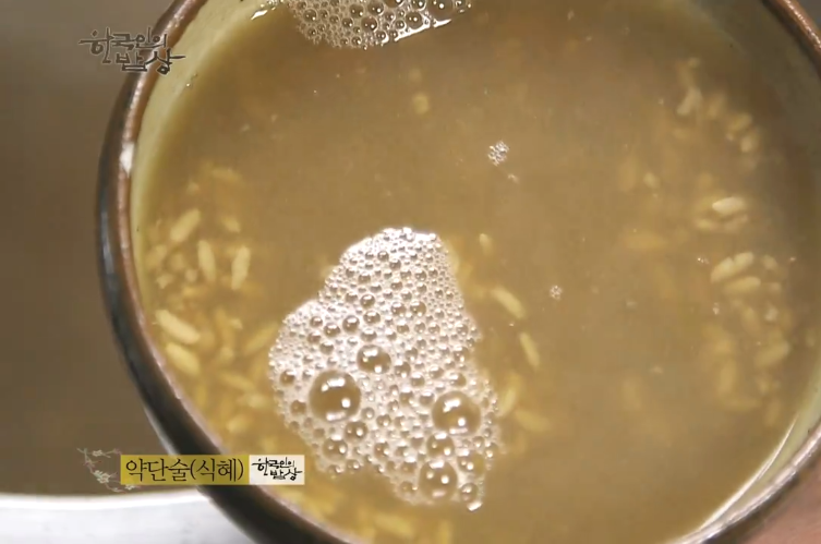 ‘약단술(식혜)’는 영지버섯, 꾸찌뽕나무, 엄나무, 오갈피, 우슬 등 15가지 약초를 넣고 솥에서 12시간 이상 푹 끓입니다. 면보에 거른 뒤에 약물에 엿기름을 빨아서 솥에 넣고 약물로 지은 고두밥을 넣고 5시간 이상 약한 불에서 저으면서 발효를 시키고 마지막에 한소끔 펄펄 끓입니다.