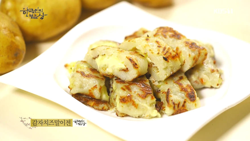 ‘감자치즈말이전’은 감자채에 밀가루를 넣고 잘 주무른 뒤에 팬에 기름을 두르고 최대한 펼쳐서 부쳐줍니다. 거의 익었을 때 치즈를 넣고 돌돌 말아 살짝 녹을 때까지 구워서 먹기 좋게 잘라줍니다.