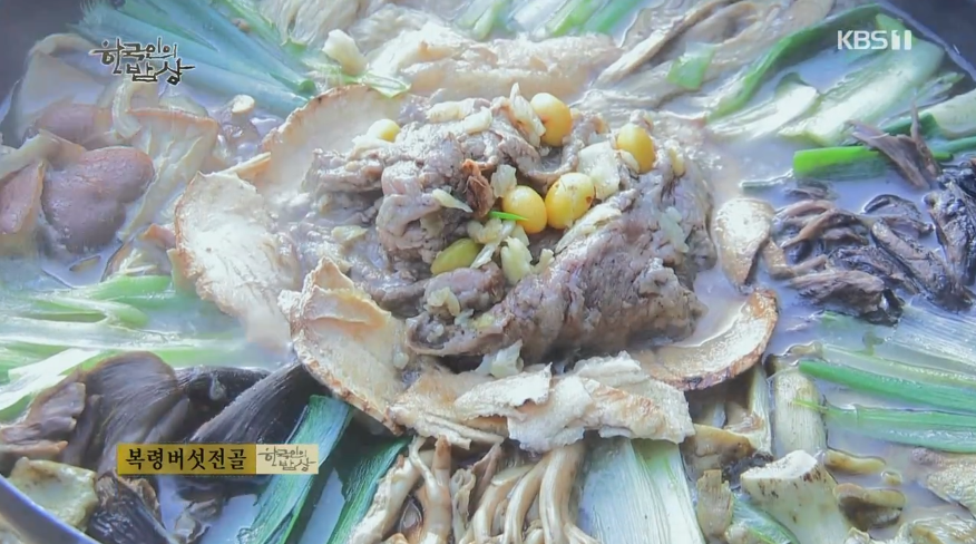 ‘복령버섯전골’은 가을에 버섯 따는 시기에 한번 삶아 염장해서 두었다가 다시 꺼내서 찬물에 담가 소금기를 빼고 꾹 짜줍니다. 냄비에 여러 버섯과 대파, 양념한 소고기, 복령 등을 넣고 육수를 부어 끓입니다.