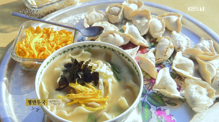 ‘꿩만두’는 꽝꽝 얼음 시냇물 위에서 꿩고기를 뼈채로 놓고 망치로 치고 칼로 곱게 다져줍니다. 다진파, 후추, 소금 넣고 간을 한 뒤에 숟가락으로 무를 긁어서 꽉 쫘서 넣고 숙주, 두부, 묵은지 등을 넣고 잘섞은 뒤에 만두피에 소를 꽉차게 넣어 빚어줍니다. 피를 뜨고 남은 꿩뼈와 무를 넣고 육수를 내서 건지고 만두를 넣고 익으면 바로 건져냅니다. 먹는 방법은 만두를 넣고 오물오물해서 뼈를 뱉어 낸다고 합니다. 그리고 국물에 만두랑 같이 익히고 지단, 김 등 고명을 올려먹습니다.