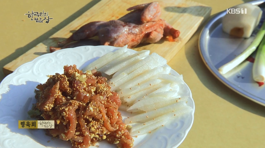 ‘꿩육회’는 겨울에 꿩을 잡아 손질한 뒤에 실로 다리쪽을 묶어 처마 밑에 달아 얼려줍니다(눈속에 넣어 얼리기도 했답니다). 꿩 가슴살을 발라 얇게 썰어 땅콩가루, 참기름, 간장, 후추를 넣고 잘 버무려서 배채와 먹습니다.
