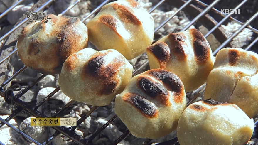 ‘옥수수송편’은 옥수수가루는 뜨거운 물로 반죽을 한 뒤에 팥소를 넣고 빚어서 시루에 넣고 쪄줍니다. 그리고 식으면 바로 딱딱해 지기 때문에 화로에 남은 재 안에 식은 떡을 넣고 구워줍니다.