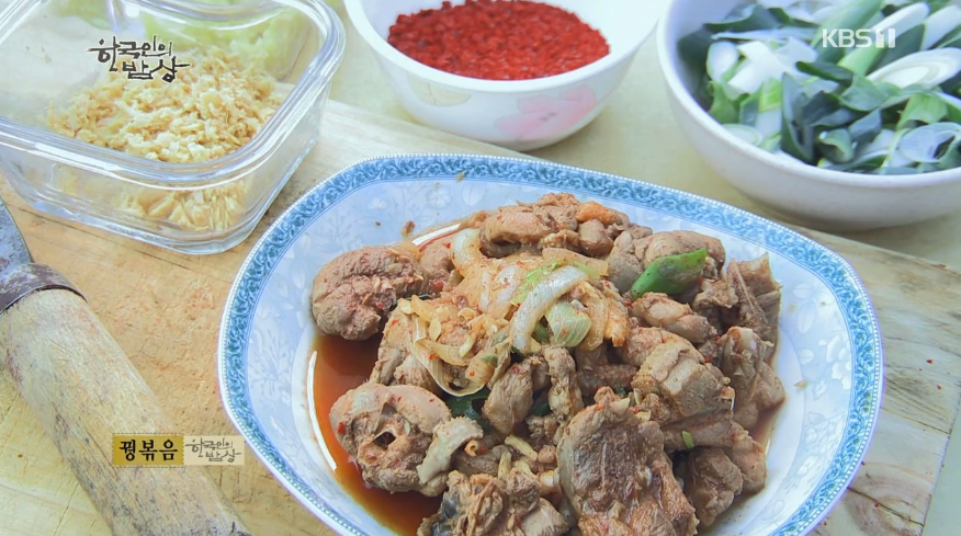 ‘꿩볶음’은 꿩은 토막을 내서 양파, 파와 함께 고춧가루, 다진마늘 등을 넣고 팬에 기름을 두르고 볶아줍니다.