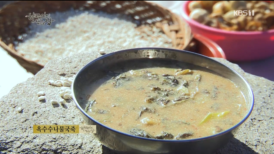 ‘옥수수나물국죽’은 된장푼 물에 우거지와 시래기를 넣고 푹 끓이다가 말린 옥수수를 맷돌에 갈아 채에 걸러 채 위에 남은 옥수수쌀을 넣어 끓입니다.