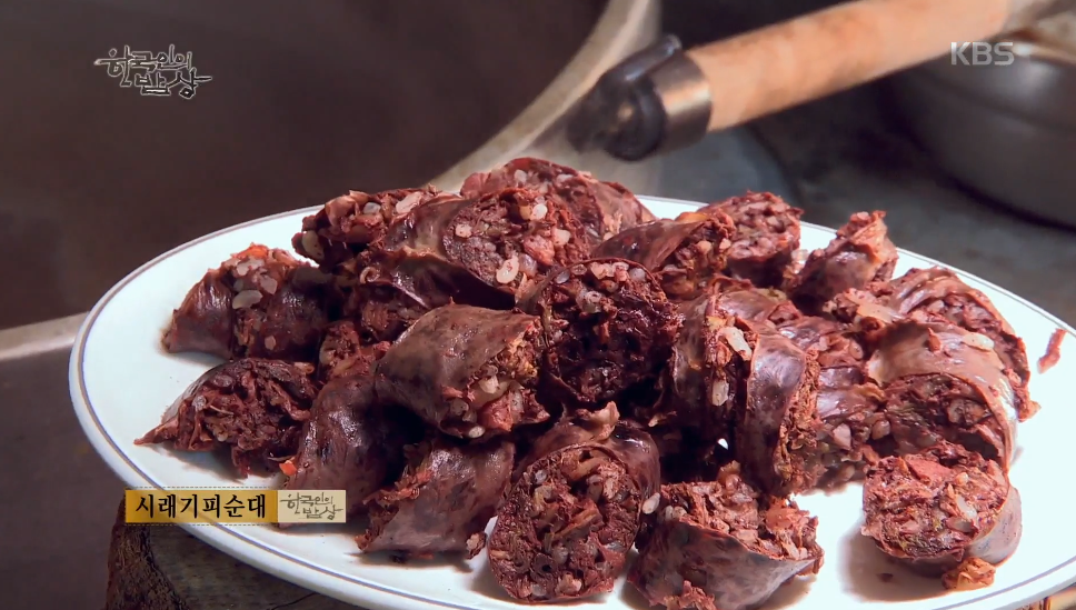 ‘시래기피순대’는 대창에 굵은 소금을 넣어 잘 씻어 줍니다. 배추시래기, 무시래기 등을 다지고 찹쌀불린 것, 선지를 넣고 고춧가루, 파 등 양념을 해서 대창에 채워넣습니다. 그리고 끓는 물에 넣고 삶아줍니다.