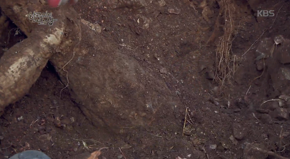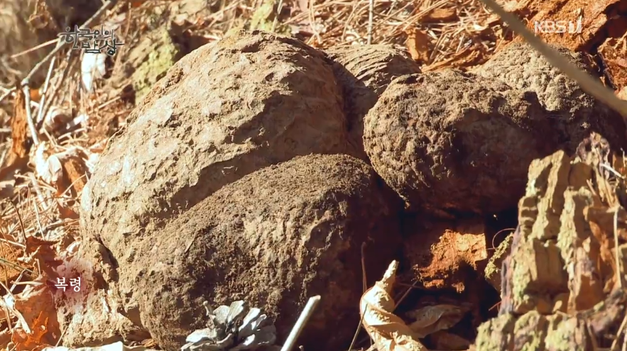 땅을 꼬챙이로 찍어서 하얗게 묻어나오면 복령이 있습니다. 소나무 뿌리 끝에서 나는 복령은 일종의 버섯이라고 합니다. 죽은 소나무 근처에 많다고 합니다.