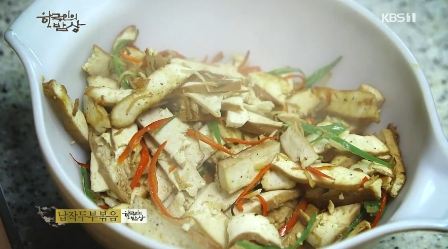 ‘납작두부볶음’은 두부를 데친 후에 면보로 싼 뒤 그 위에 도마를 올리고 무거운 돌을 올려 반나절 눌러줍니다. 팬에 양조간장과 생강채를 넣은 뒤 눌러둔 두부를 넣고 부칩니다. 그리고 얇게썰어 고추채와 한 번 더 볶아줍니다.
