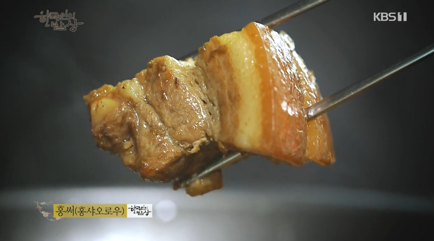 ‘홍써(홍샤오로우)’는 끊는 물에 두꺼운 오겹살을 넣고 삶아줍니다. 달군팬에 양조간장, 생강채를 넣고 삶은 오겹살을 넣고 물을 자작하게 넣고 졸이다가 얼음사탕(빙탕)을 넣고 불린 표고버섯, 당근 등을 넣고 졸이다가 고추를 넣고 한소끔 끓입니다.